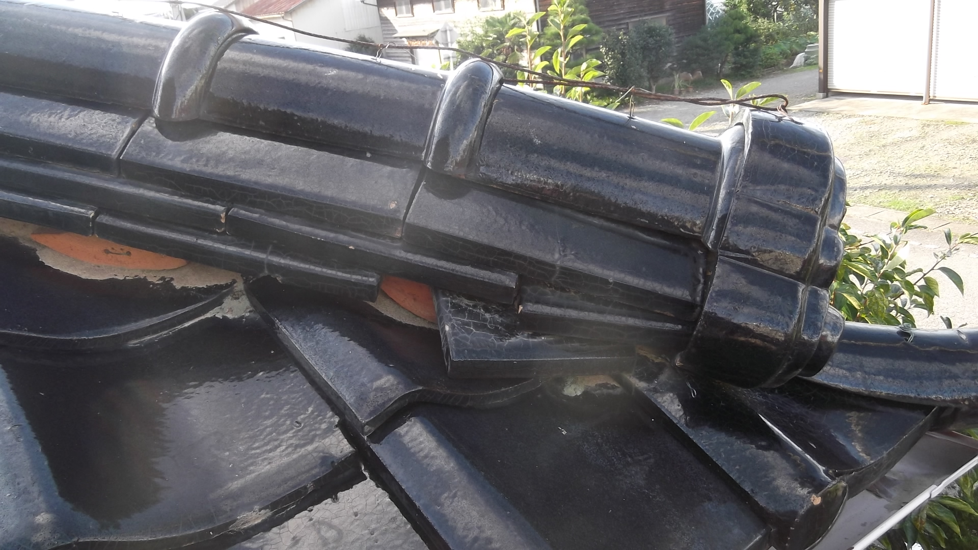 M様の屋根を点検すると瓦の傷み、棟のズレ、谷板に穴が確認されました。