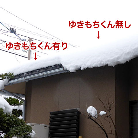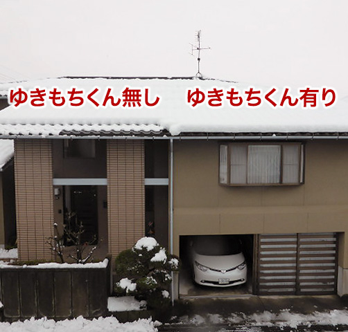 ↑写真の屋根の左半分が「ゆきもちくん」有り、右半分が「ゆきもちくん」無し(落雪前)です