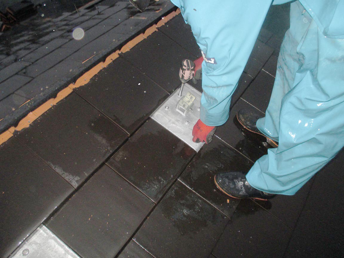 太陽光パネルを支えるラックの土台となる位置の陶器瓦の代わりに、アルミ製の支持瓦を葺いていきます。