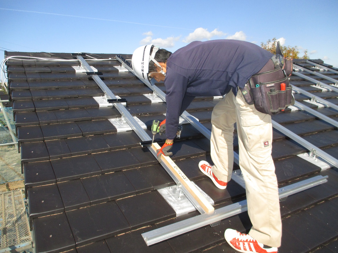 そして支持瓦にラックを順次固定していきます。この固定をしっかり合わせないと、歪んでパネルが収まりません。慎重な施工が求められます。